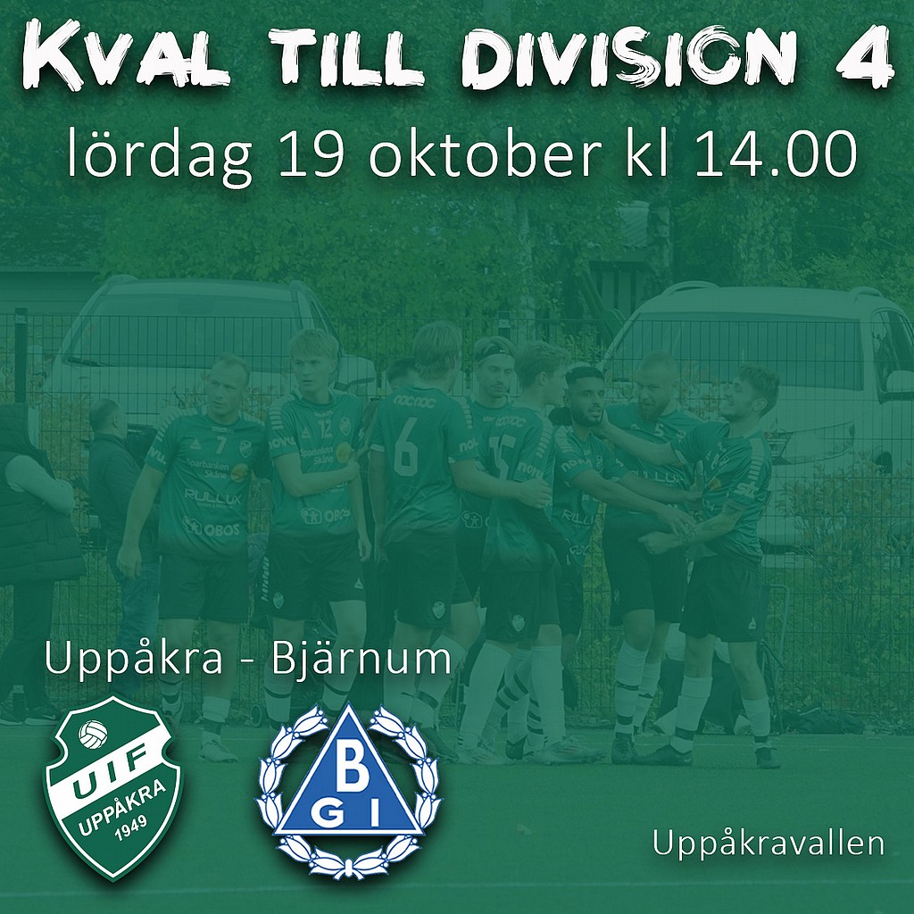 Efter den fina vändningen mot Ekeby i kvalets första omgång ställs vi nu mot Bjärnum i två avgörande matcher kring vilken förening som spelar i division 4 nästa säsong. Bjärnum slutade på tionde plats i sin division 4-serie och ställs nu mot ett formstarkt Uppåkra. Det kommer bli två spännande matcher och vi inleder på hemmaplan nu på lördag klockan 14.00. Vi hoppas då på ett väldigt stort stöd från våra ungdomsledare och deras spelare samt alla övriga inom föreningen och Hjärupsborna. Låt oss tillsammans med Uppåkra Ultras skapa grönsvart magi! Välkomna!