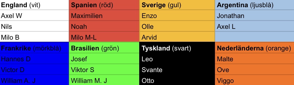 Vilket lag ni ingår i ser ni på bilden. Där står även vilken färg på tröjan ni ska spela i.