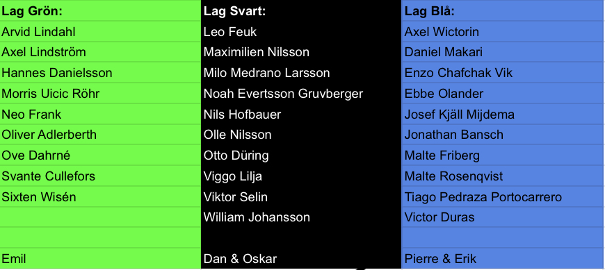 Lag svart: 17:50 (första match 18:30)