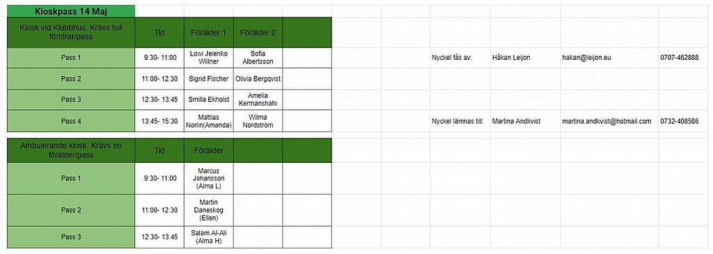 Då alla inte fyllde i schemat som skickades ut via mail har vi slumpat in namnen i schemat. Om ni behöver byta pass så bara ta kontakt med de föräldrar ni vill byta med. Kravet från föreningen är två föräldrar per pass (barn tillåts ej i kiosken).